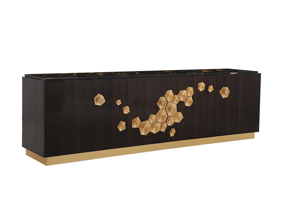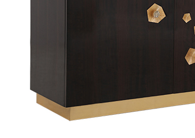 精选桦木搭配烟熏尤加利木皮,面板天然大理石,配有四扇柜门,柜门上带有几何形雕刻图案,图案贴有金箔;柜内配有四个储物抽屉及三块木制可调隔板,柜内配有黑色多功能插座,抽屉使用自回弹托底滑轨;产品使用镜面金色花形拉手;整个底座贴金箔。